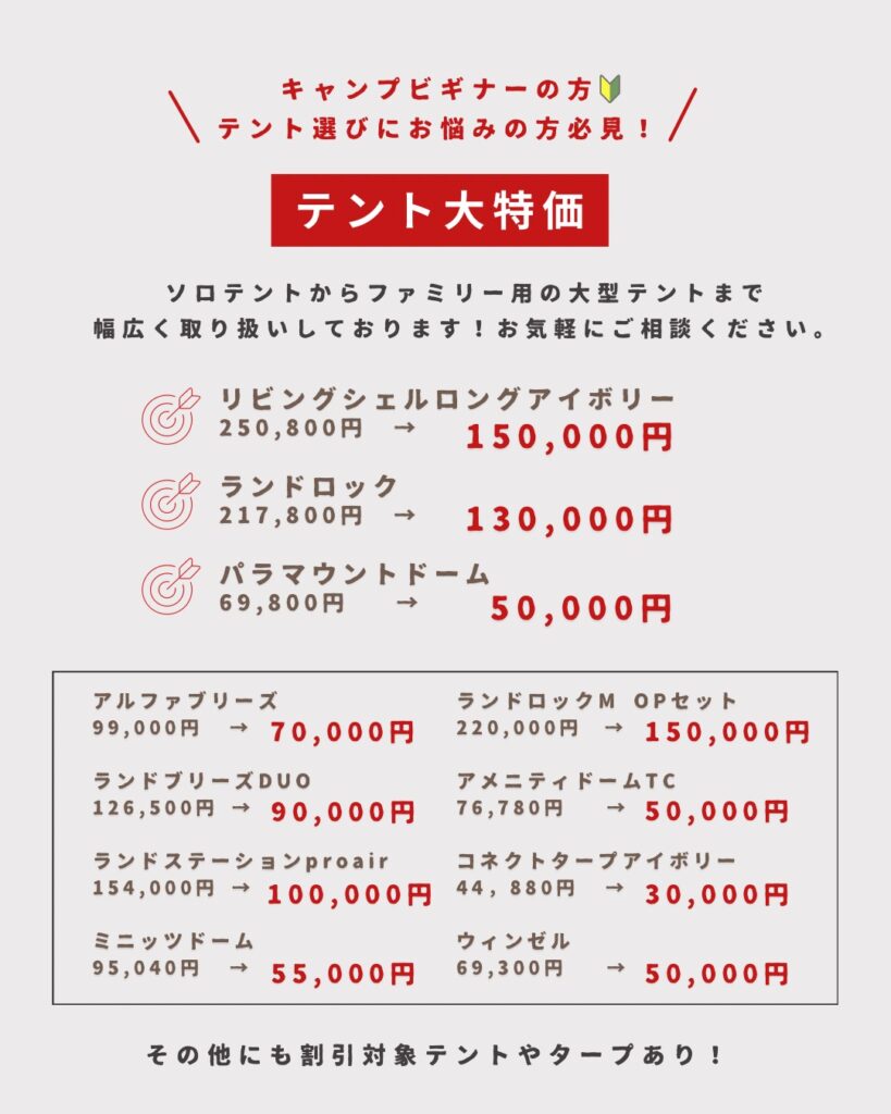 普段セールされないようなスノーピーク製のテントが多数ラインナップしてます!