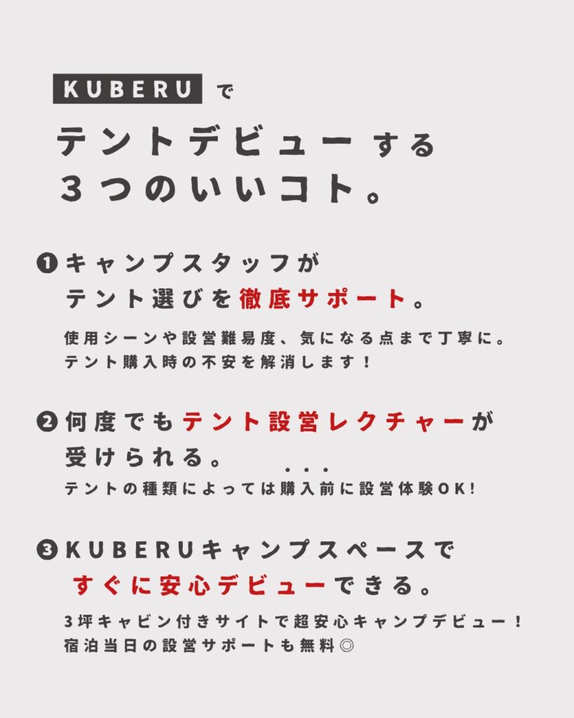 キャンプビギナー様のキャンプへのハードルを少しでも下げたいと思い、KUBERUからお客様へキャンプスタイルの提案や設営をお手伝いできたらと思います。